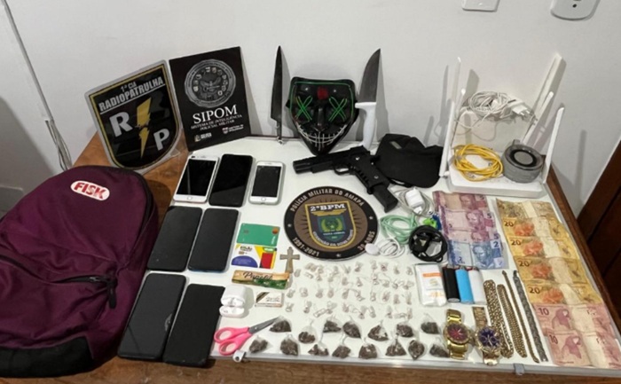 Durante a diligência, os militares encontraram, dentro de uma mochila vermelha, 40 pedras de substância supostamente entorpecente do tipo crack, 15 porções de maconha, um simulacro de arma de fogo, uma máscara comumente utilizada em assaltos, sete aparelhos celulares, duas facas, materiais para preparo e acondicionamento de drogas, roteadores e a quantia de R$ 167 em dinheiro.