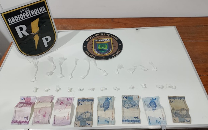 No bolso da bermuda do suspeito foram encontradas 12 porções de substância esbranquiçada com odor característico de crack, embaladas em plástico. No bolso traseiro, havia outras 10 porções semelhantes à cocaína em pó. Ao todo, foram apreendidas 22 porções de entorpecentes. Com ele também estavam R$ 25 em notas miúdas, possivelmente oriundos da venda de drogas.
