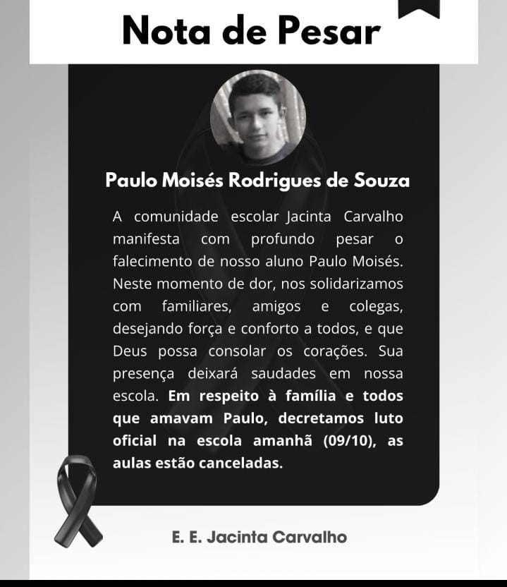 A Escola Estadual Jacinta Carvalho, onde ele estudava, emitiu nota de pesar e decretou luto nesta quinta-feira, 9.