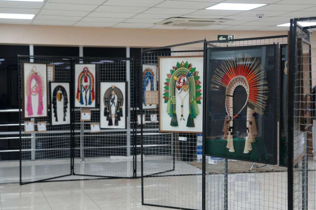 Segue aberta a mostra “Amazônia Viva – Pelos Olhos de Quem Conhece e Cuida”, da artista Débora Almeida, que reúne quadros e objetos artísticos, como cocar indígena e representações de animais em perigo de extinção no Brasil