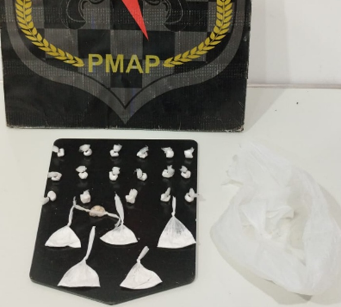 A movimentação levantou suspeita imediata e motivou a abordagem. Ao verificar o material abandonado, os policiais encontraram 23 porções de substâncias semelhantes a cocaína e crack.