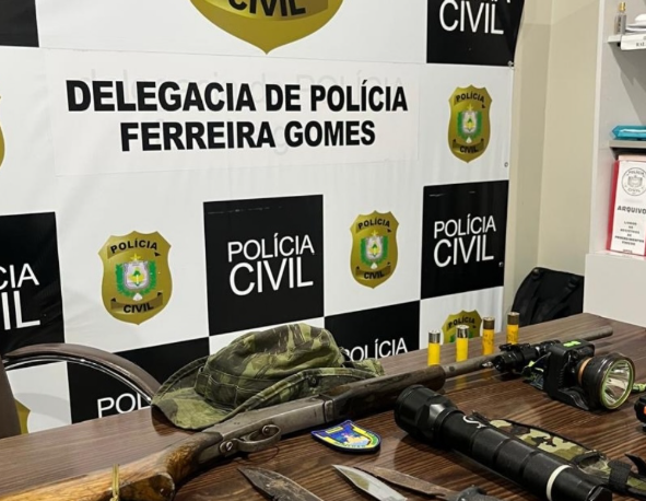 Já no município de Ferreira Gomes, durante fiscalização no ramal do Corre Água — que liga o distrito de São Joaquim do Pacuí ao assentamento Ferreirinha — a equipe atuou para apurar denúncia de possível desmatamento. Na ação realizada no dia 22, os policiais abordaram um veículo Gol branco com quatro ocupantes. Durante a vistoria, foi encontrada uma espingarda calibre 20 com quatro munições intactas, configurando crime previsto no Estatuto do Desarmamento. No porta-malas, os militares localizaram aproximadamente 30 quilos de carne de veado, 10 quilos de carne de jacaré e 14 ovos de jacaré, além de lanternas e facas, caracterizando prática de caça ilegal.