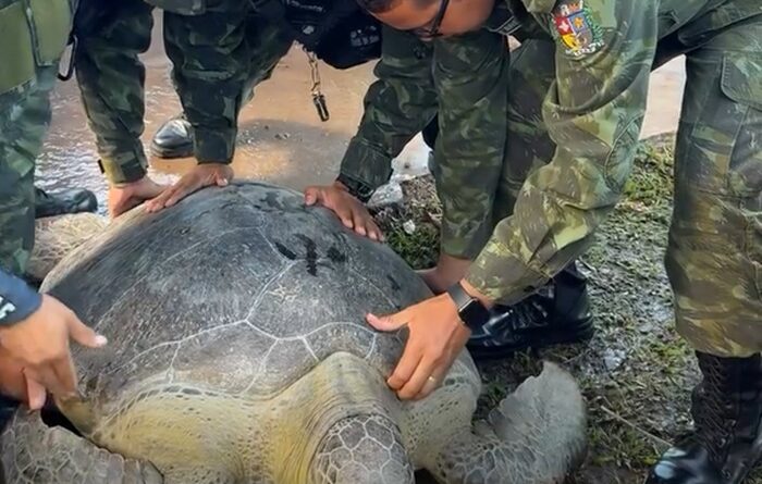 Batalhão Ambiental resgata tartaruga marinha de 200 kg ferida em rio no interior do Amapá