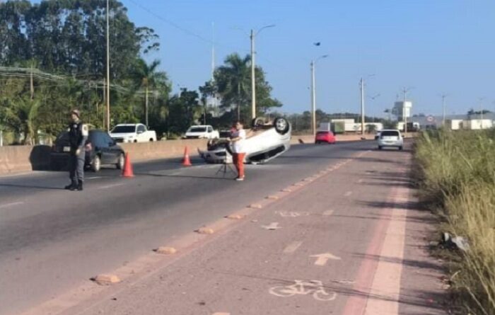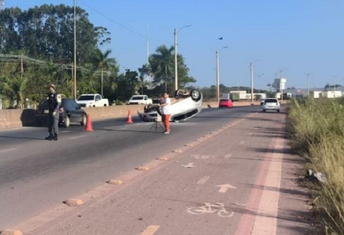 Uma equipe do Batalhão de Policiamento Rodoviário Estadual (BPRE) foi acionada para atender a ocorrência. De acordo com o batalhão, o motorista perdeu o controle do veículo, bateu na mureta e capotou. Ele sofreu apenas escoriações e estava sozinho no carro.