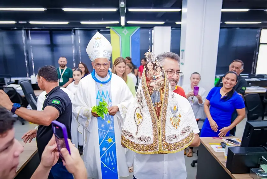 A imagem da santa foi conduzida pelo governador Clécio Luís e pela primeira-dama, Priscila Flores, da entrada do prédio até o salão nobre, onde foi celebrada missa solene pelo bispo Dom Antônio de Assis de Ribeiro. Colaboradores, secretários de governo e autoridades participaram da cerimônia, unindo-se em oração pela padroeira da Amazônia.