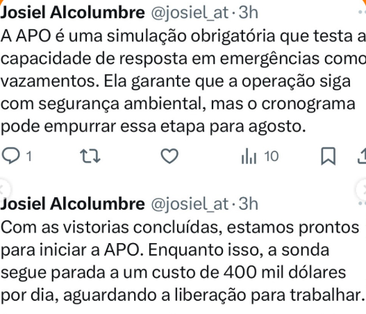 “Enquanto isso, a sonda segue parada a um custo de 400 mil dólares por dia, aguardando autorização para trabalhar.”, concluiu Josiel.