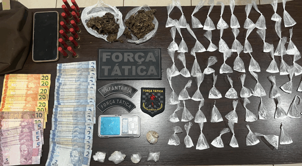 Durante patrulhamento, os policiais abordaram o suspeito e, dentro de sua mochila, encontraram porções de substâncias supostamente entorpecentes dos tipos maconha, crack e cocaína, além de uma caixa de munições de arma de fogo calibre 410 e dinheiro.