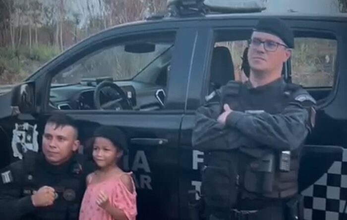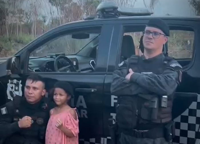 Surpresos e tocados pela atitude, os policiais pararam o veículo e desceram para agradecer o carinho. A menina, radiante, recebeu o cumprimento dos militares, um momento de alegria genuína registrado pela equipe.