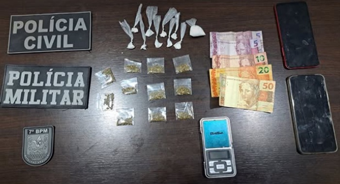 A segunda prisão também ocorreu no mesmo bairro. O suspeito tentou escapar, mas foi rapidamente capturado. Com ele e no imóvel onde estava, foram encontrados dinheiro, balança de precisão e porções de substâncias análogas à maconha e ao crack.