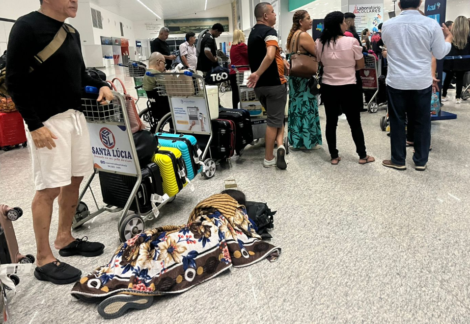 Imagens registradas por passageiros mostram crianças e adultos dormindo no chão, sem qualquer estrutura para esperar por tantas horas.