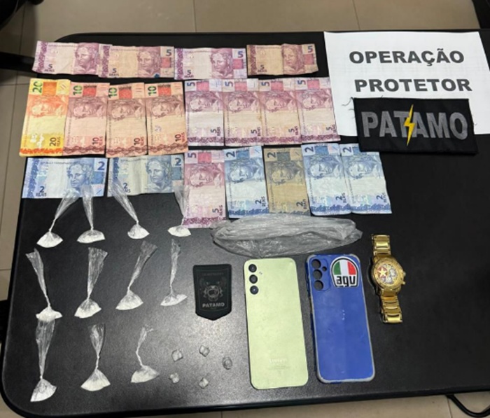 Na revista pessoal, foram encontradas 16 porções de substância supostamente entorpecente, além de R$ 107 em dinheiro. O adolescente informou aos policiais que estava comercializando as substâncias no local.
