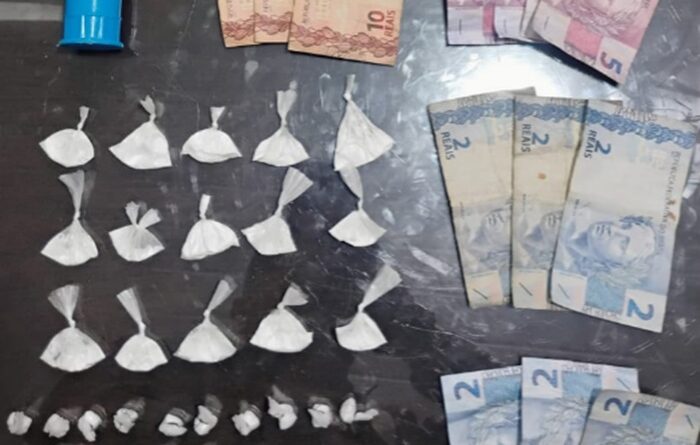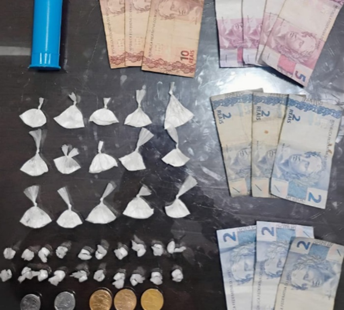 Na revista pessoal, os militares encontraram 20 porções de crack e 15 porções de cocaína guardadas em um recipiente plástico dentro do bolso do casaco, além de R$ 65 em espécie.