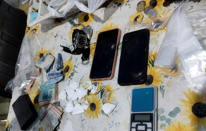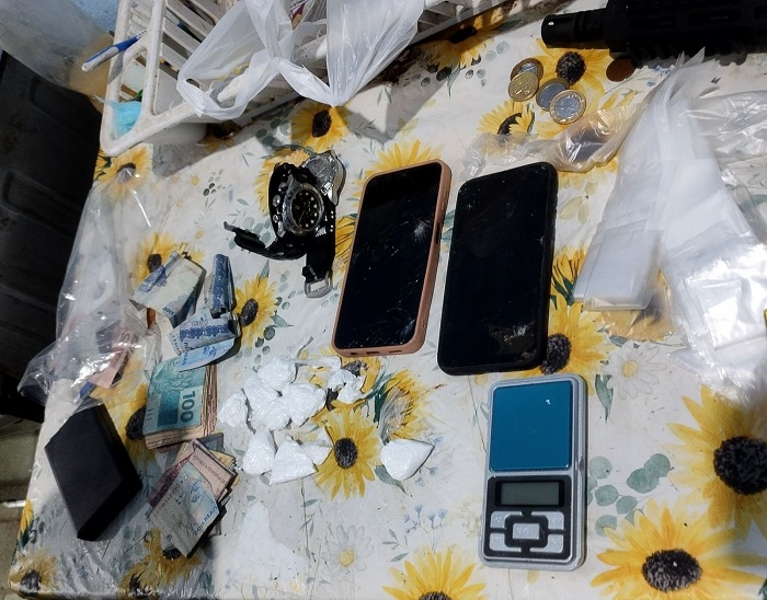 No quarto, foram encontradas 14 porções de cocaína no bolso de uma bermuda atrás da porta, além de uma balança de precisão, material para embalagem, sete celulares sem procedência comprovada, cinco relógios e R$ 240 em espécie. Questionado, o suspeito confessou que vendia drogas no local.