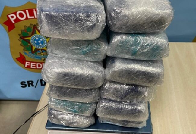 A ação foi realizada em conjunto com a Receita Federal, após a identificação de uma bagagem suspeita durante inspeção por raio-x. Na verificação, os agentes encontraram 13 tabletes da droga.
