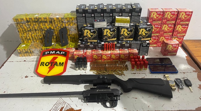 Durante a revista, foi encontrado em um dos veículos um rifle CBC calibre .22 Magnum, de ação semiautomática, além de uma luneta, carregadores e diversas munições de diferentes calibres.
