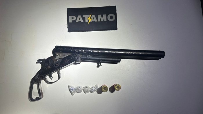 A Polícia Científica recolheu o armamento, uma espingarda calibre 12, de cano cerrado, contendo duas munições percutidas, além de apreender porções de substância supostamente entorpecente encontradas no bolso do indivíduo durante os trabalhos periciais.
