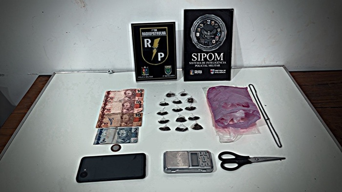 Ainda durante a ocorrência, o homem autorizou a entrada da equipe policial na residência. No interior do imóvel, foram encontrados uma balança de precisão de pequeno porte, sacos plásticos utilizados para embalar drogas e uma tesoura.