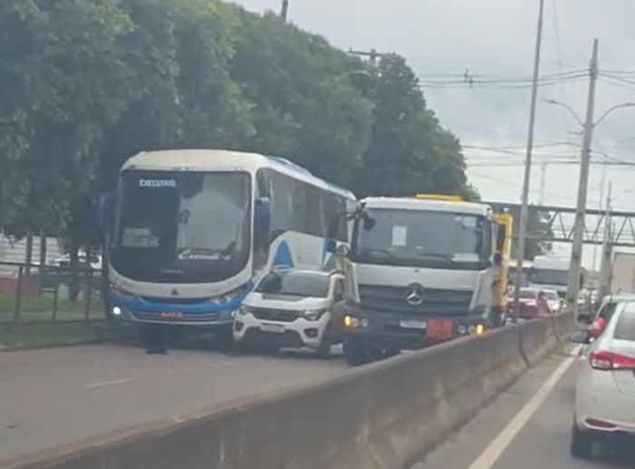 Nas imagens, é possível ver o veículo espremido entre os dois veículos de maior porte, ocupando a pista. Até o momento, não há informações oficiais sobre como o acidente ocorreu nem sobre a existência de feridos.